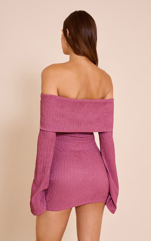 Mauve Textured Bardot Long Sleeve Bodycon Dress